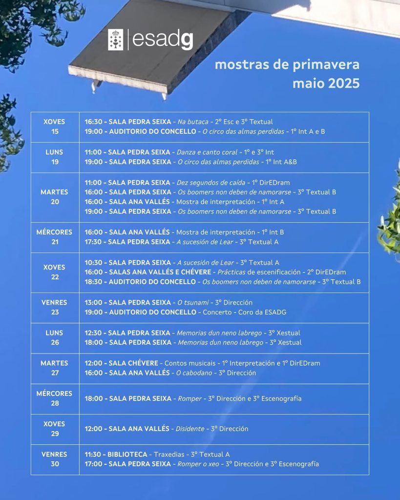 Leer más🌼🍀 MOSTRAS DE PRIMAVERA 2025 🍀🌼Velaquí temos xa a programación dos espectáculos que o alumnado da ESADG presentará nas vindeiras semanas, unha oferta suculenta e xenerosa, froito do intenso traballo que se está a realizar en todas as especialidades...