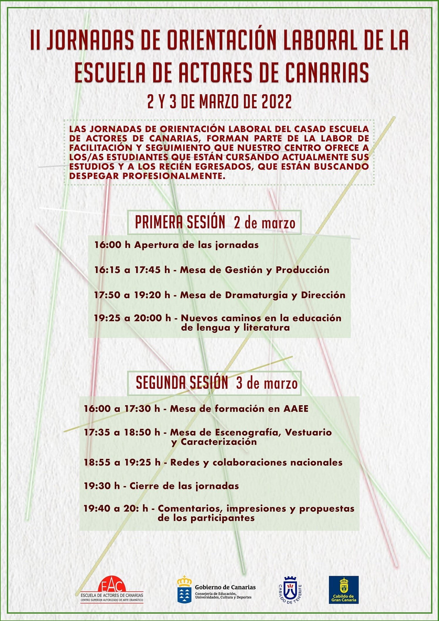 2 y 3 de marzo de 16:00 a 20:00hLas Jornadas de Orientación Laboral del CASAD Escuela de Actores de Canarias, forman parte de la labor de facilitación y seguimiento que nuestro centro ofrece a los/as estudiantes que están cursando actualmente sus estudios y a los recién egresados, que están…Leer más