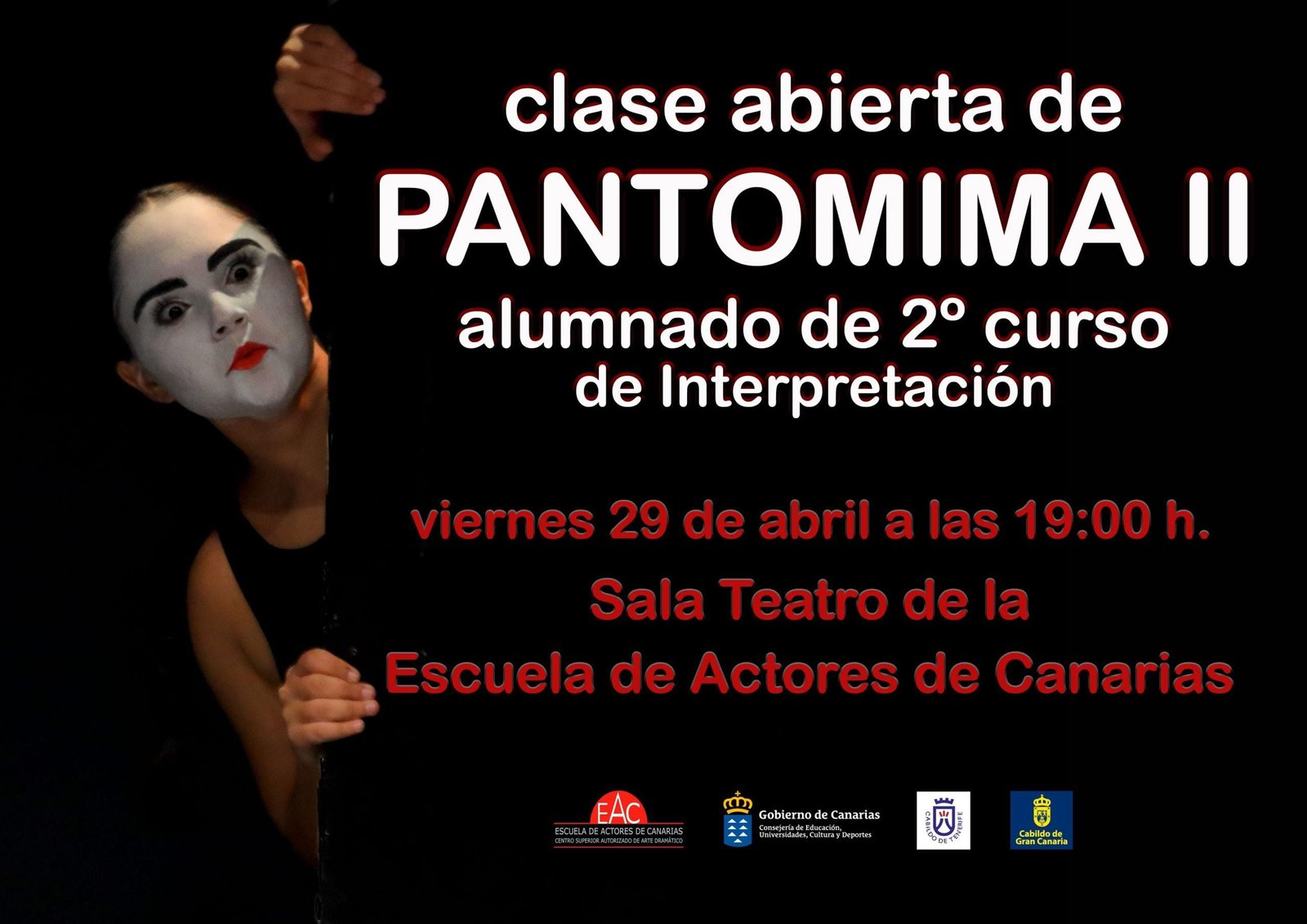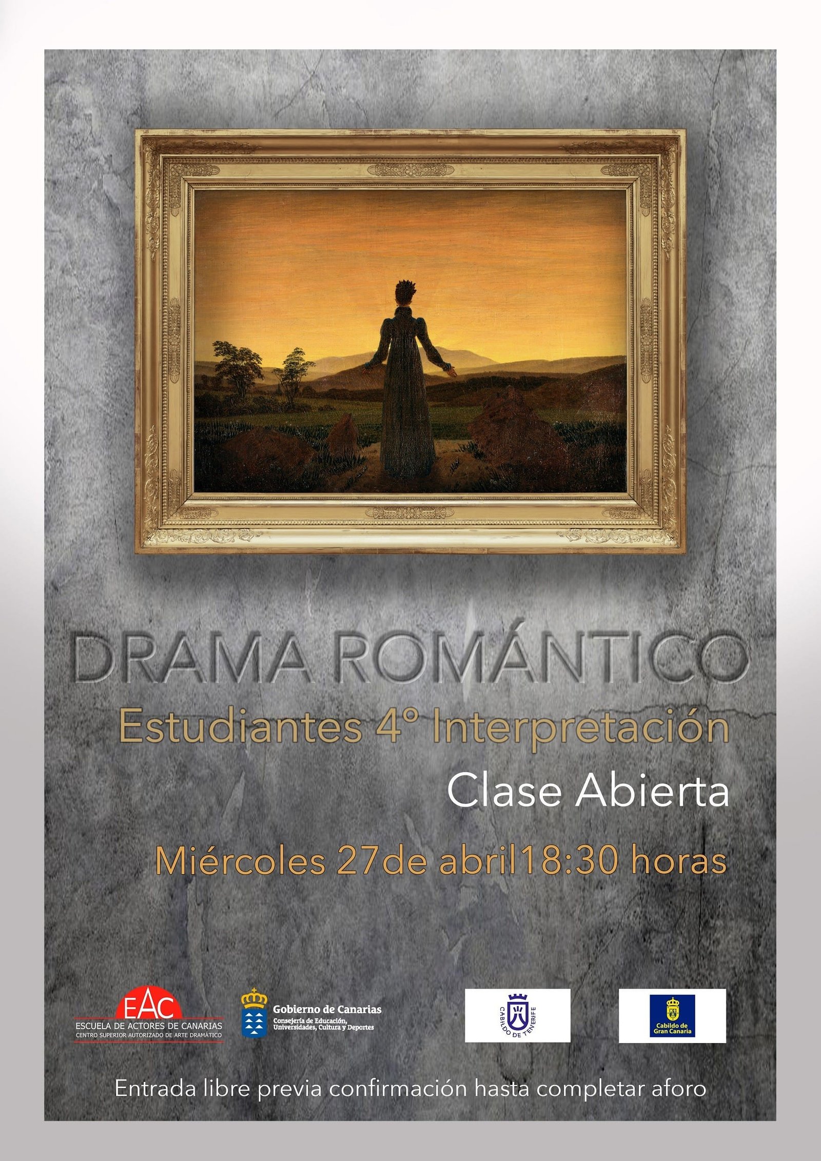 Viernes 29 de abril, 19:00 h.El viernes 29 de abril, a las 19:00 horas, en la Escuela de Actores de Canarias (Centro Autorizado Superior de Arte Dramático) C/ Pedro Suárez Hernández (tranvía Conservatorio), tendrá lugar una “clase abierta” realizada por los estudiantes de segundo curso de Interpre…Leer más