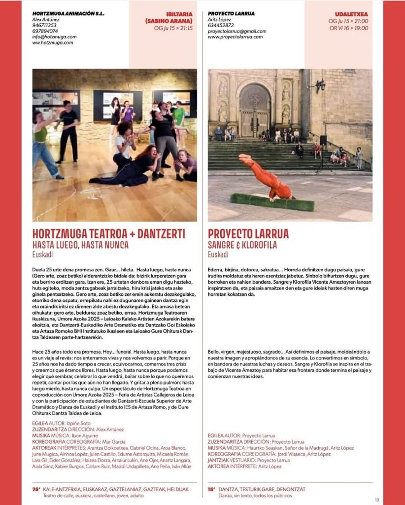 Leer másGaur da eguna, gaur GERO ARTE, AGUR BETIKO plazaratuko dugu. Lan asko, inplikatutako jende asko, ilusio handia, emozio handia...Hortzmuga Teatroaren ikuskizuna, Umore Azoka 2025-Leioako Kaleko Artisten Azokarekin batera ekoitzia, eta Dantzerti-Euskadiko Arte Dramatiko eta Dantzako Goi Eskolako eta Artaza Romoko...