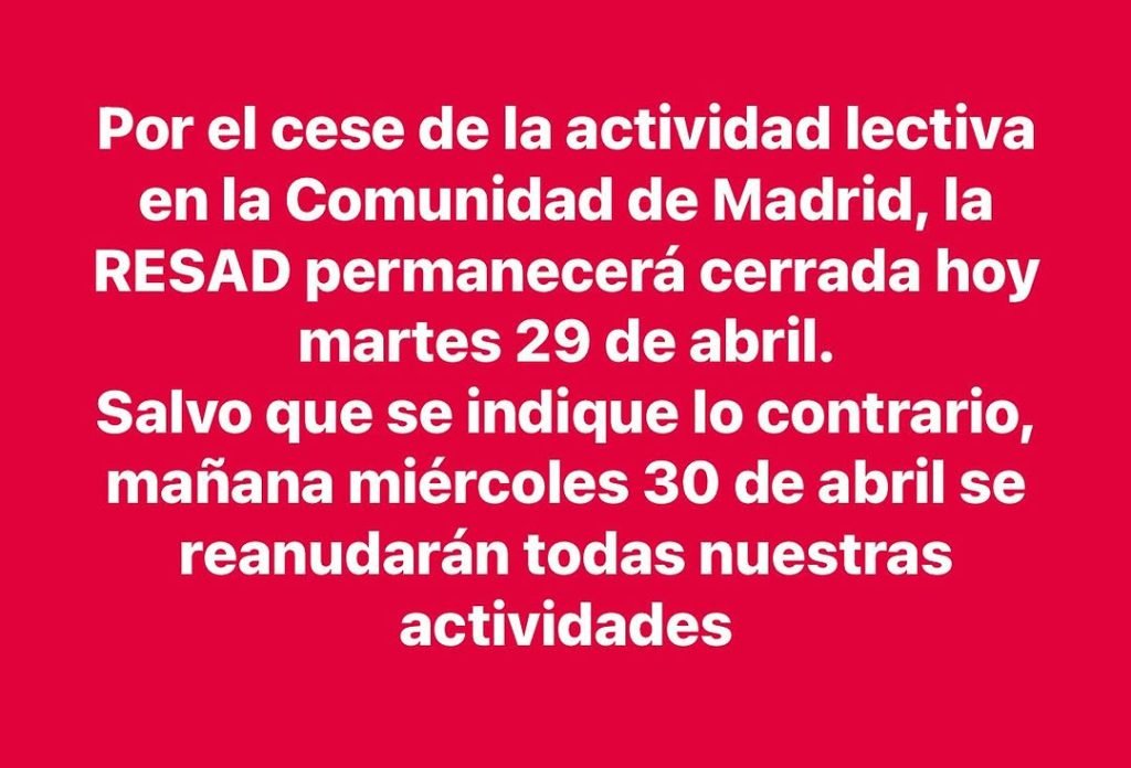 Leer másPor el cese de la actividad lectiva en la Comunidad de Madrid, la RESAD permanecerá cerrada hoy martes 29 de abril. Salvo que se indique lo contrario, mañana miércoles 30 de abril se reanudarán todas nuestras actividades
